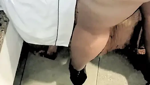 Hot BBW MILF lets herself be fucked her hairy pussy with her legs open and he cum inside